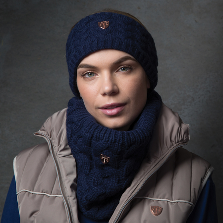 Deep, cosy cable loop scarf snood. Features metal fleur badge to front. Ideal for all yard duties and training. Stretch fit. One size fits all! 100% polyester.