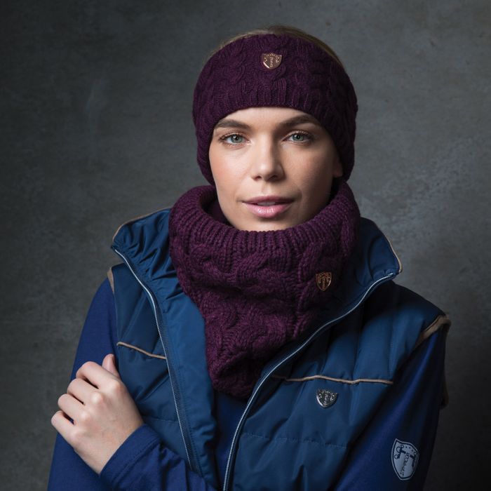 Deep, cosy cable loop scarf snood. Features metal fleur badge to front. Ideal for all yard duties and training. Stretch fit. One size fits all! 100% polyester.